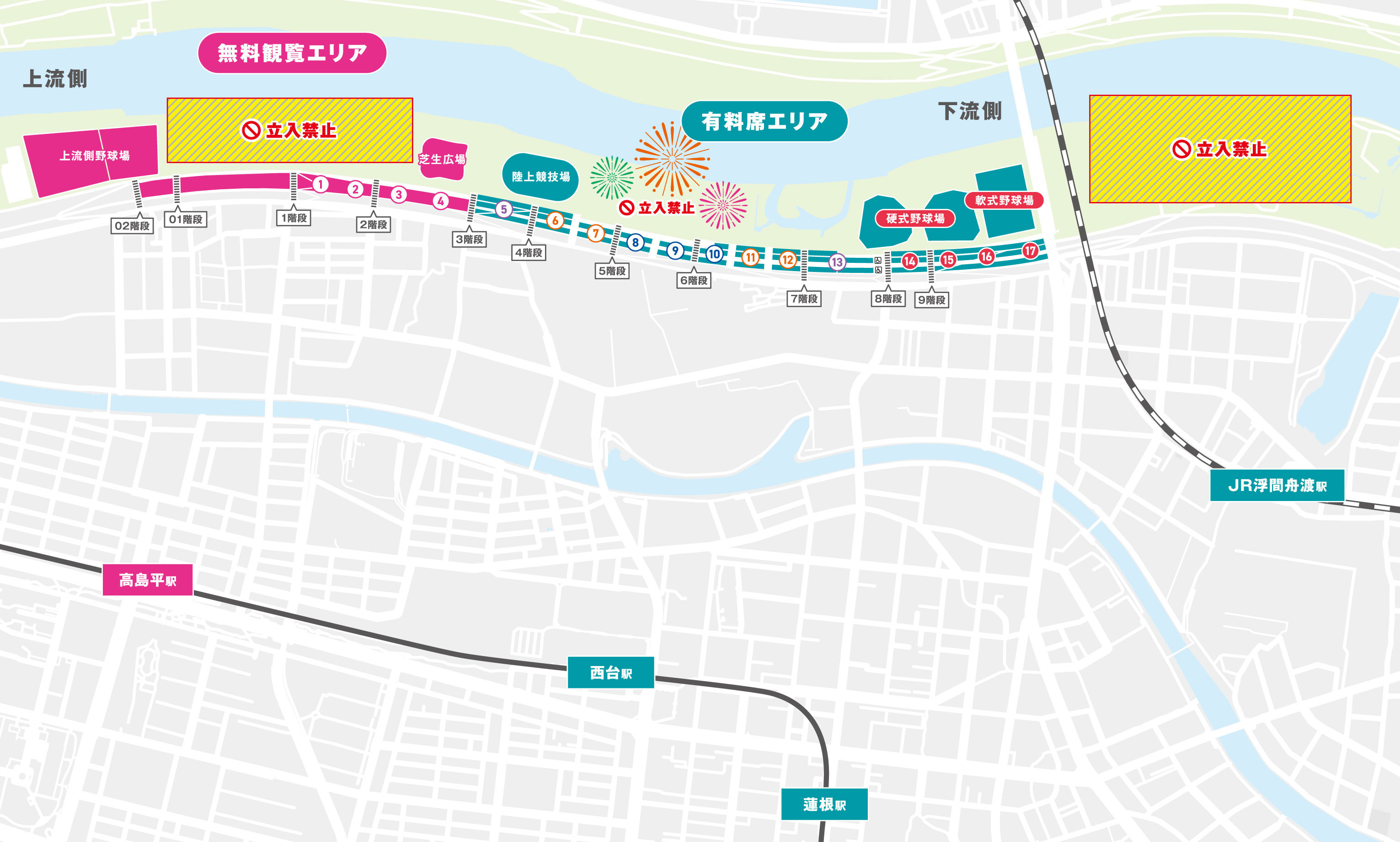 会場内で無料観覧できる場所は上流側野球場、芝生ひろば、1-4エリアです